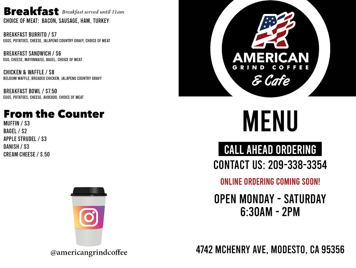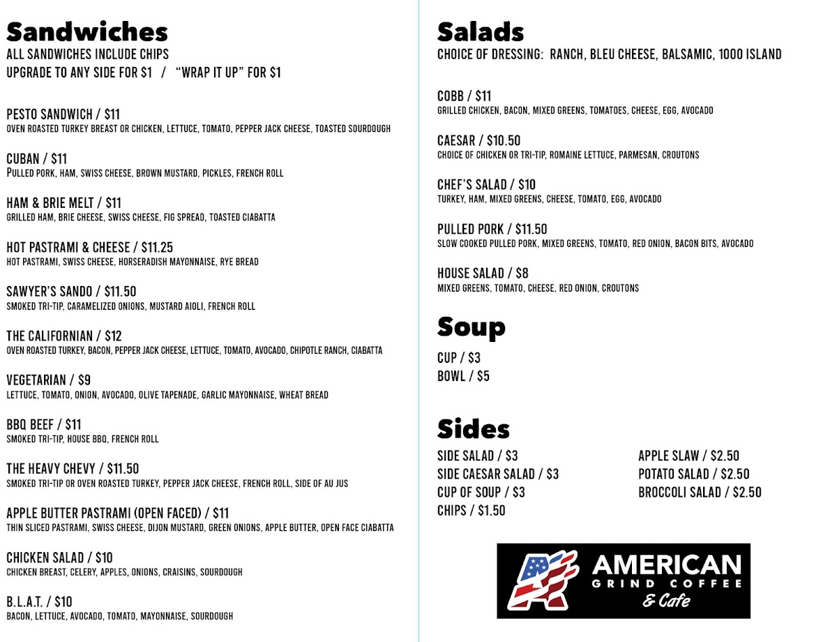 American Grind Coffee And Cafe offers a diverse and appealing menu with something for everyone. Their premium espresso drinks include unique options like the Nutty Mocha and Campfire White Mocha, with prices reflecting their quality. For a little extra energy, you can add an Energy Shot to any beverage. The menu also features a variety of pastries such as the rich Basque Cheesecake and fresh Scone, perfect for a light snack or breakfast. Speaking of breakfast, options are available until 11am, including the hearty Breakfast Bowl and savory Texas Toast Melt. For lunch, the selection of sandwiches is notable, with choices like the Pesto Sandwich and the indulgent The Heavy Chevy. For those preferring a lighter option, there are soups and salads, including the classic Cobb Salad and Asian Chicken Salad. A variety of drinks is also available, such as the refreshing Caribbean Squeeze and comforting Chai Tea. To accompany your meal, choose from sides like the Bowl of Soup or a Side Caesar Salad. Whether you're stopping by for a quick bite or enjoying a leisurely meal, American Grind's menu offers a delightful variety of flavors to satisfy any craving.